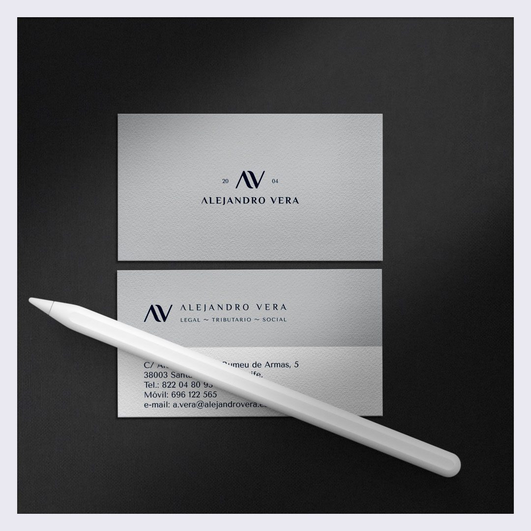 Diseño de marca personal elegante que posiciona a Alejandro Vera como un aliado experto asesor. La variante seleccionada equilibra conceptos como trayectoria sólida, soluciones integrales para los negocios y una imagen moderna e impecable en el corazón urbano de Tenerife.