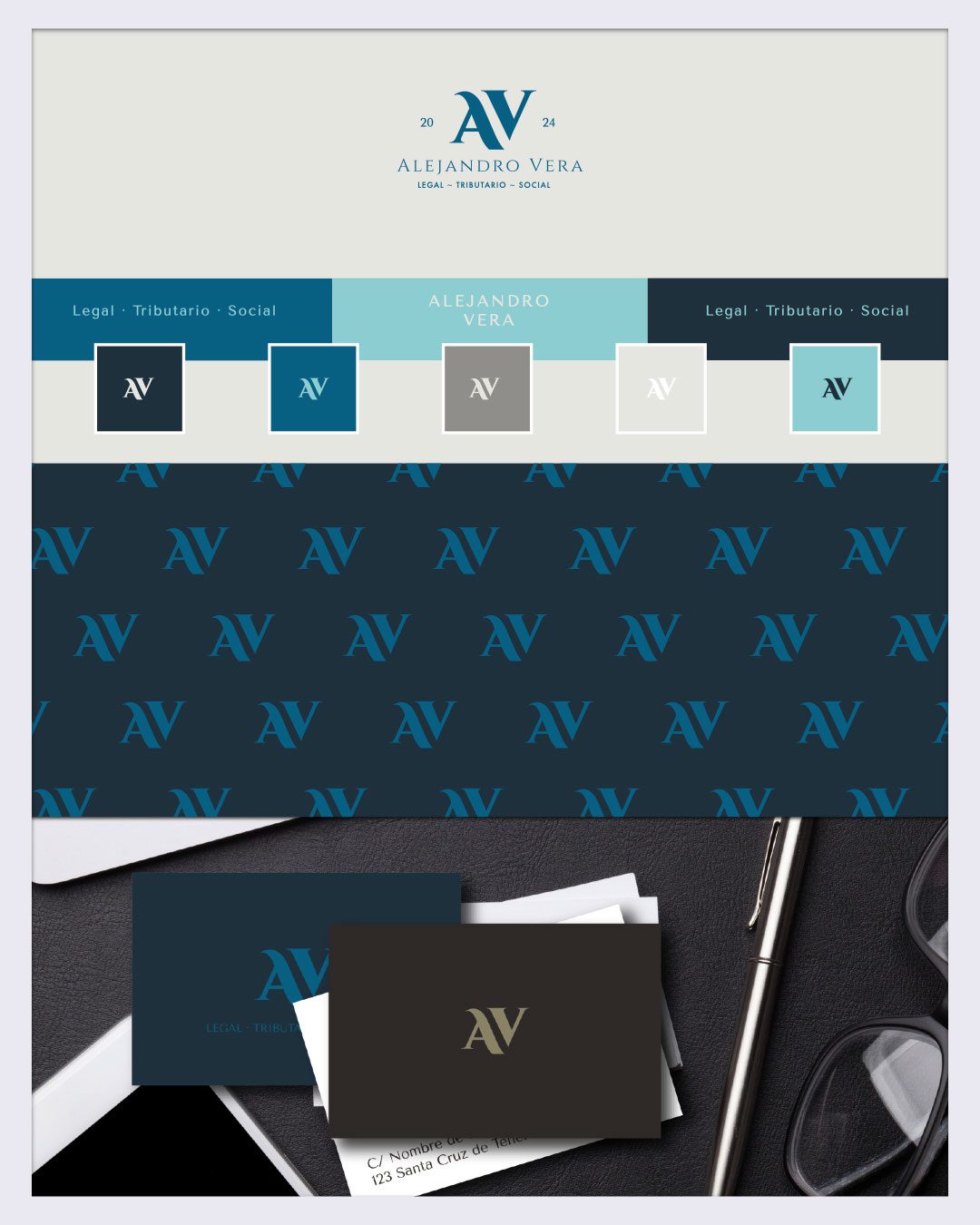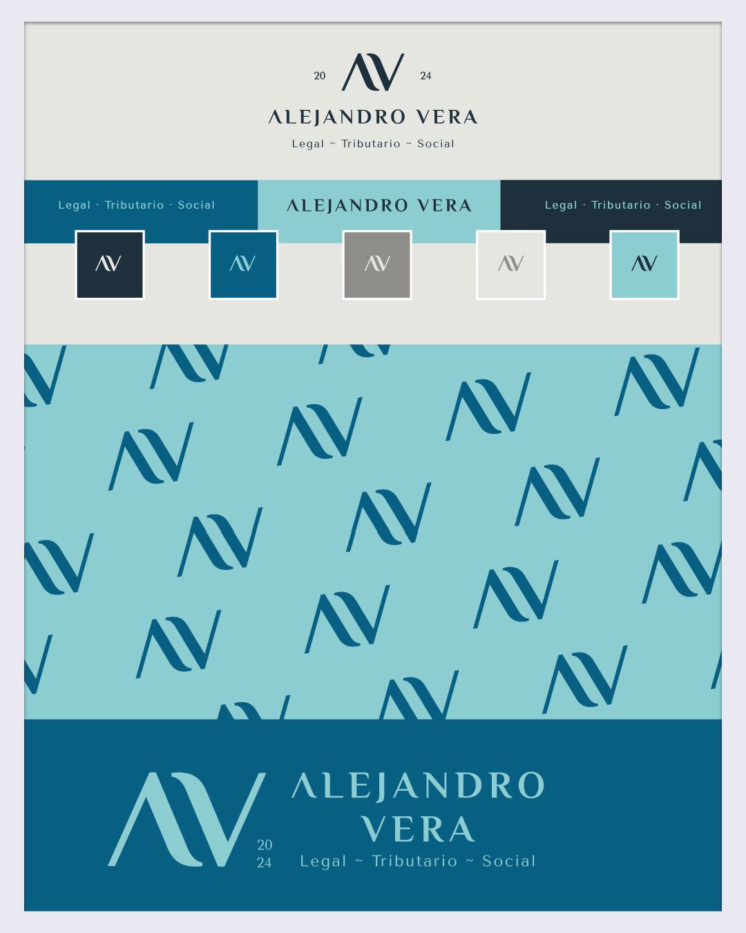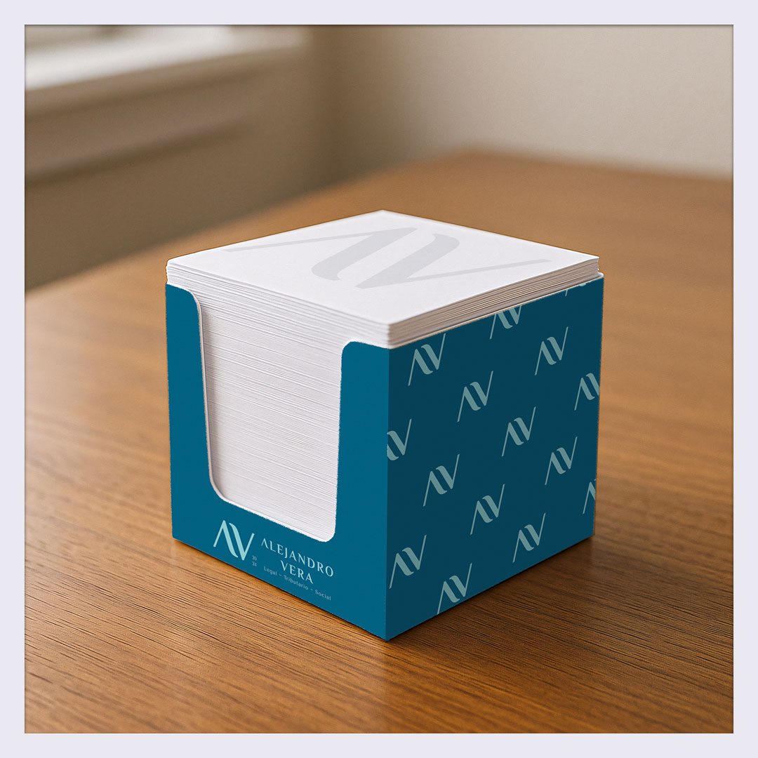 La selección de una paleta sobria de azules profundos y grises suaves fue clave para transmitir confianza absoluta, eficiencia y calma bajo presión —ideal para un asesor que maneja con soltura litigios, impuestos y seguridad social de todo tipo de negocios y empresas. El juego tipográfico completó el diseño: la «A» y la «V» del logo parecen la misma letra rotada en un giro simétrico y elegante, aportando modernidad y vigencia con un trazo minimalista que habla por sí solo de precisión y confianza. Por cierto, también se exploraron versiones alternativas, esas gemelas creativas que siempre preparo para dar al cliente la seguridad de una buena elección con diseños que aguantan el paso del tiempo.